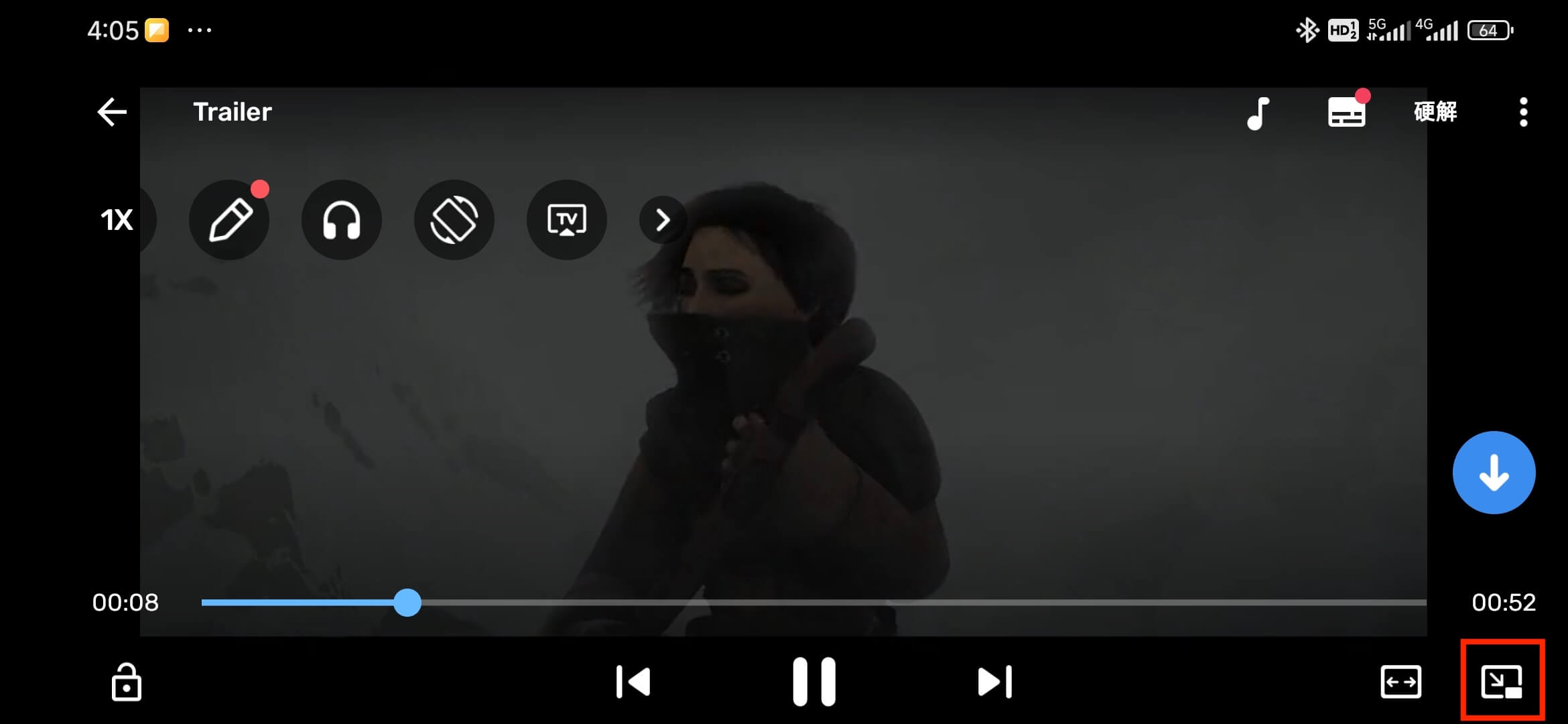 点击嗅探工具条中的播放按钮,即可调用 MX Player 播放视频。此时您就可以使用 MX Player 的画中画模式播放网页中的视频。