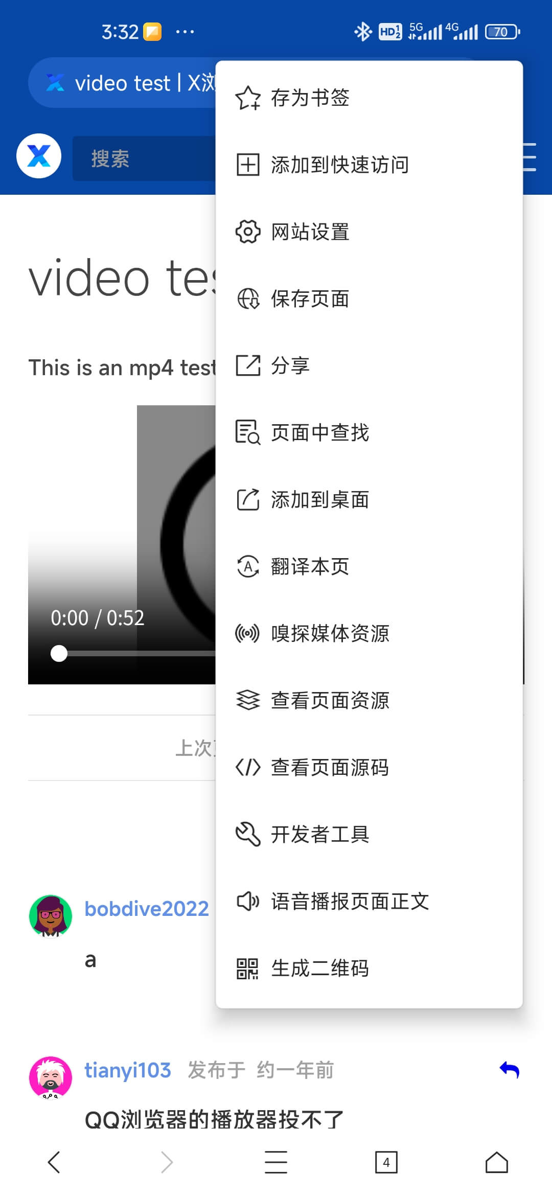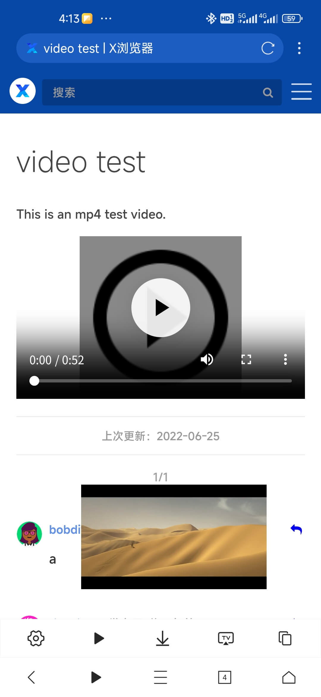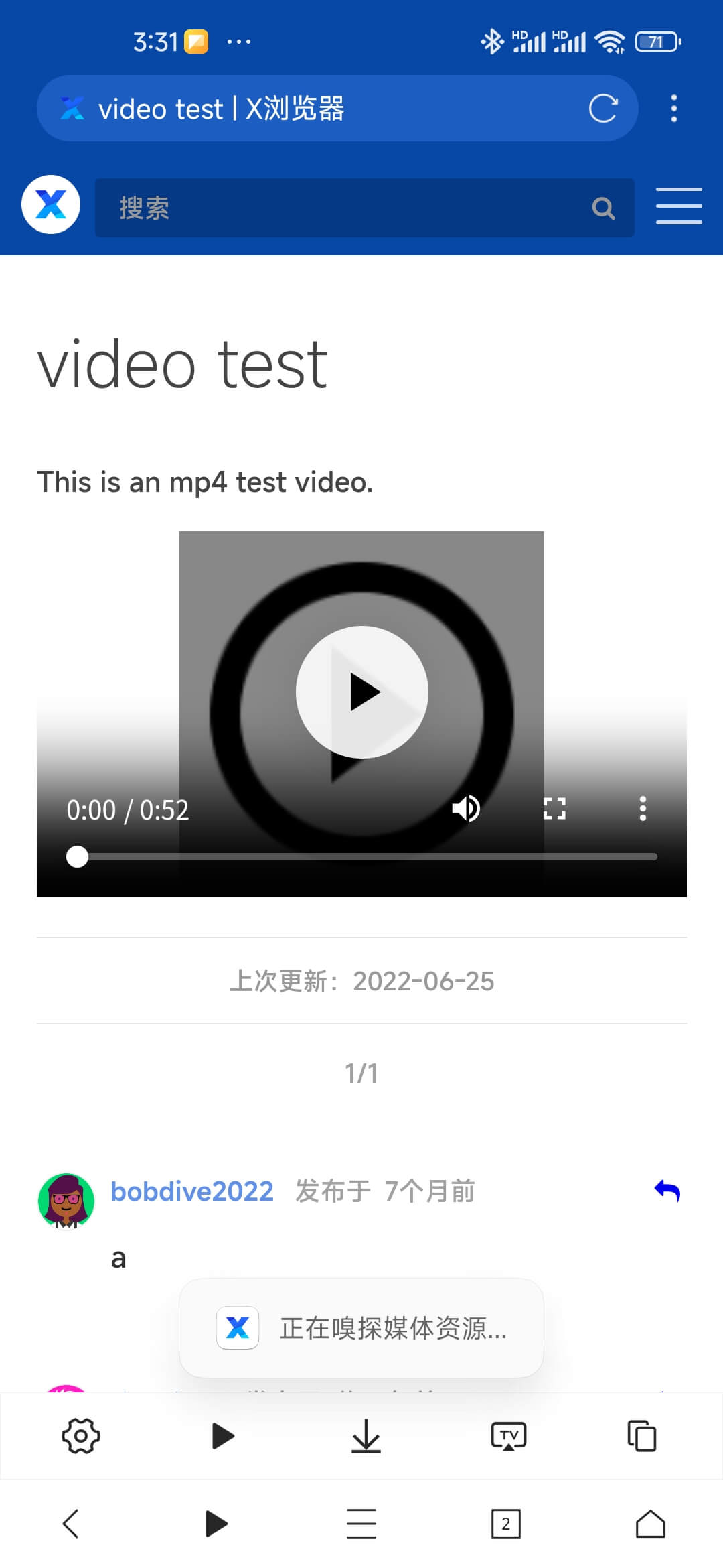 X浏览器 支持嗅探网页中的视频资源。您需要在 X浏览器 中打开想要播放的视频网页,然后通过工具箱中的“嗅探媒体资源”选项嗅探当前页面的视频资源。这里有个测试页面可以用于测试视频嗅探功能。